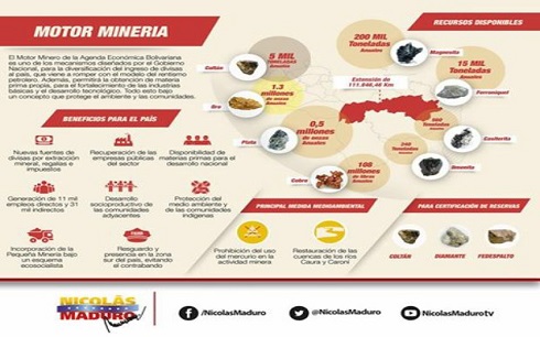 Maduro, por su parte, compartió a través de su cuenta en Facebook una infografía donde explica el Motor Minero, “que impulsa el desarrollo integral del Arco Minero del Orinoco«, basándose en la «conformación de empresas mixtas, a través de la inversión pública y privada, de empresas nacionales y extranjeras, bajo un concepto novedoso, donde utilizamos la tecnología de punta para la conservación ambiental, recuperación de cauces de nuestros principales ríos, protección de las comunidades y pueblos indígenas adyacentes, así como el resguardo soberano del sur de nuestro país”.