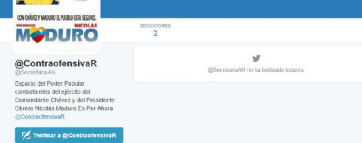 @ContraofencivaR es como ahora se identifica la antigua cuenta de la Asamblea Nacional, y reza en su biografía «CONTRAOFENSIVA REVOLUCIONARIA: Espacio del Poder Popular, combatientes del ejército del Comandante Chávez y del Presidente Obrero Nicolás Maduro».