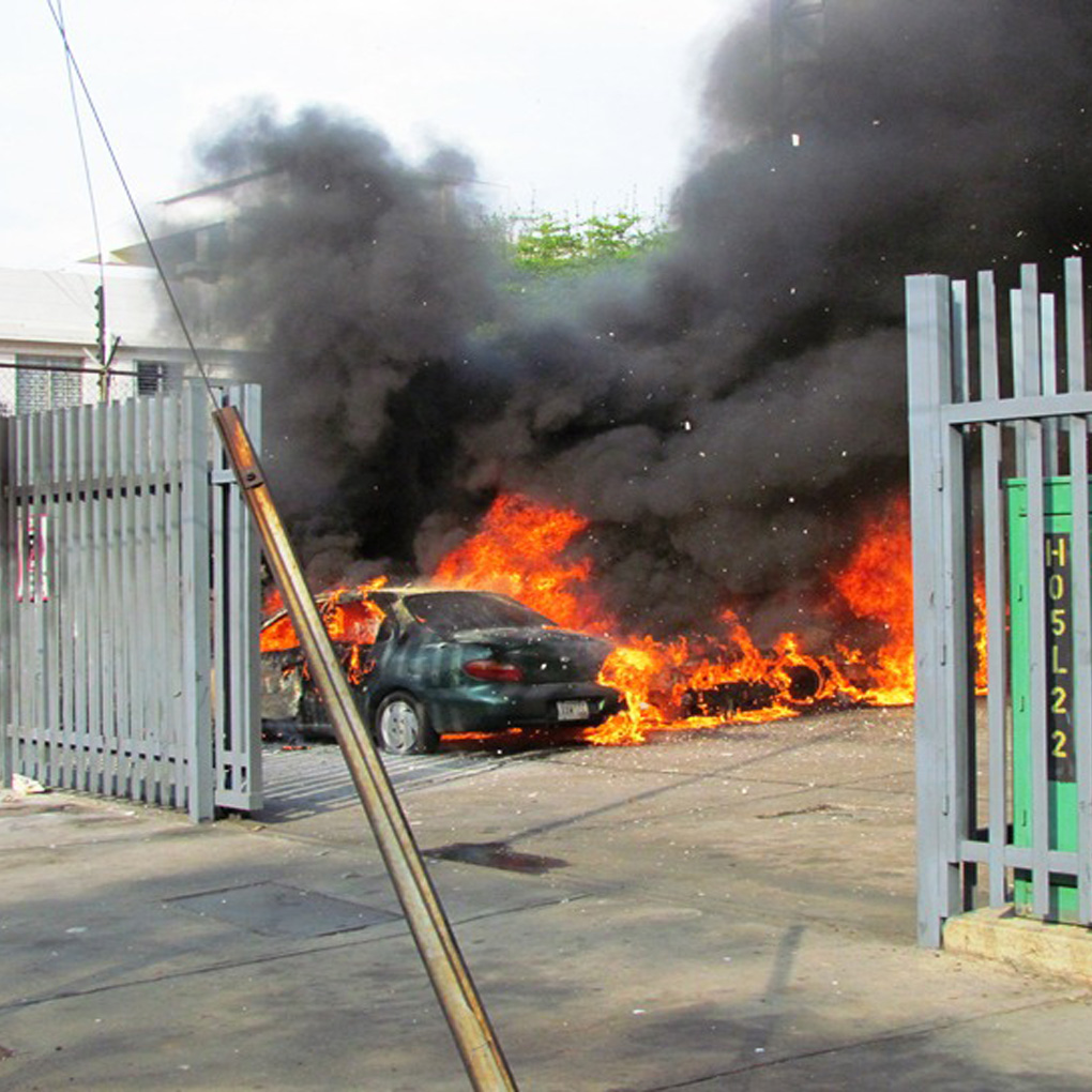 Atacan con explosivos sede del diario Versión Final en Maracaibo. Al parecer, dos sujetos en moto se acercaron y sin mediar palabras, arrojaron, aparentemente, una granada al interior del estacionamiento de ese medio de comunicación zuliano. La explosión afectó cuatro vehículos propiedad de algunos trabajadores y de un cliente.