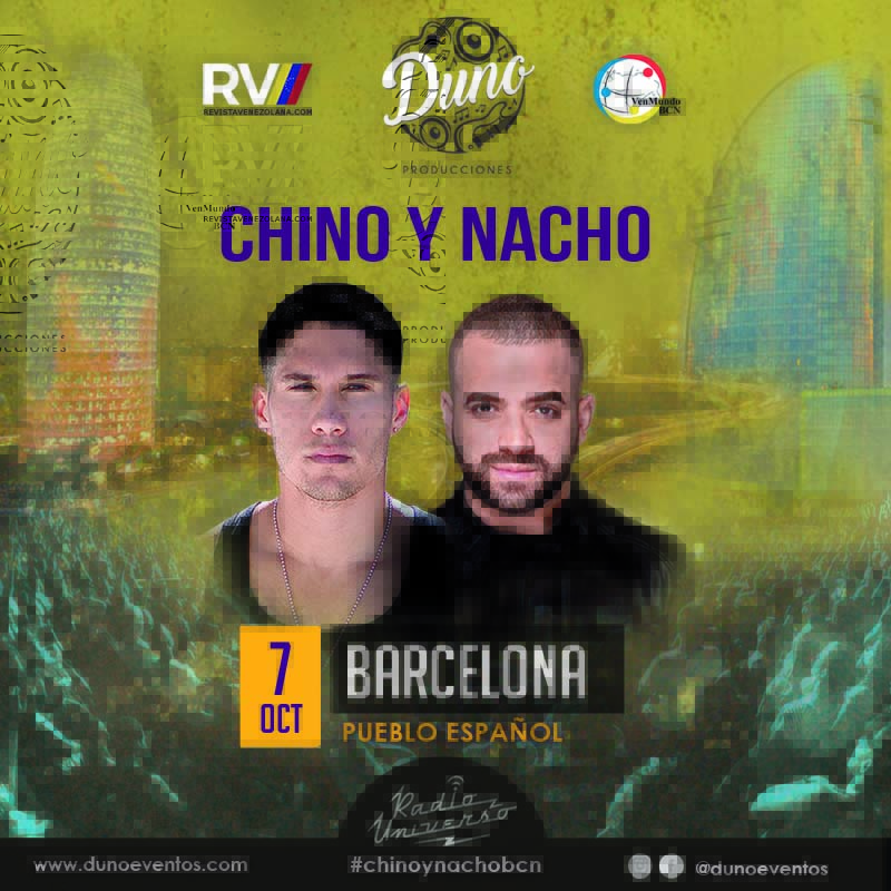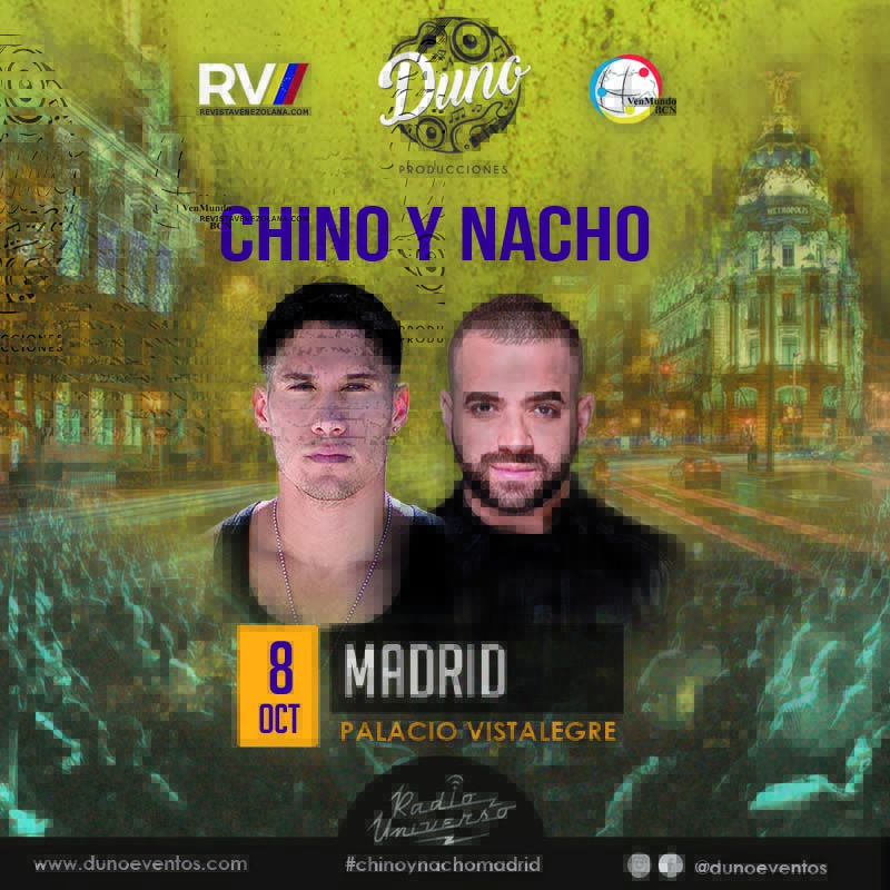 El dúo de reguetón y música tropical más premiado de los últimos años Chino y Nacho presenta su concierto Radio Universo Tour 2016 en España el 7 y 8 de octubre.