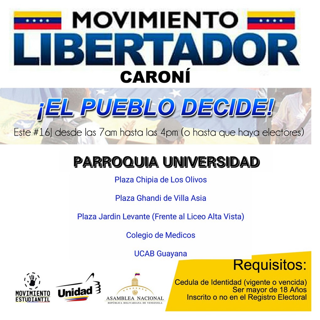 Restan cinco días para la consulta popular convocada por la Asamblea Nacional, y la pregunta de los ciudadanos que participarán es dónde votar el 16 de julio. La Mesa de la Unidad Democrática (MUD) ya afinó los detalles para el proceso del próximo domingo, definiendo la ubicación de los llamados puntos soberanos.