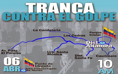 La marcha convocada para mañana por la Mesa de la Unidad Democrática (MUD) culminará con una concentración en la autopista Francisco Fajardo, a la altura del Distribuidor Altamira, donde rechazarán la actuación de los magistrados del Tribunal Supremo de Justicia, que con sus decisiones en contra de la Asamblea Nacional han roto el hilo constitucional. Es por ello, que los representantes de la oposición han invitado a sus simpatizantes a participar de forma masiva y pacífica en la actividad denominada “La tranca contra el golpe”, allí estarán presente tanto diputados de la Asamblea Nacional, como dirigentes políticos y sociales que integran la alianza opositora.
