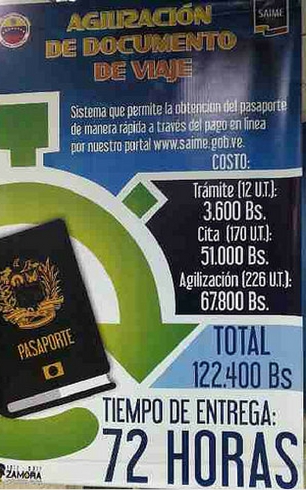 Actualmente, el costo regular del trámite son 12 unidades tributarias (U.T), es decir 3 mil 600 bolívares, pero para solicitar el pasaporte express se le sumará a la suma anterior un monto de 170 U.T, es decir 51 mil bolívares.