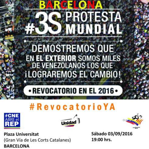 El sábado 3 de septiembre a las 7:00 pm los coterráneos residenciados en la ciudad de Barcelona se concentrarán en la Plaza Universitat, a fin de apoyar la Toma de Caracas. Lo mismo hará la comunidad venezolana en Tenerife a las 5:00 pm en la Plaza España: “Por la libertad de los presos políticos, por la apertura del canal humanitario, por la apertura del Registro Electoral Permanente (en el exterior), por el pago a los jubilados”. En la Plaza de la Feria de Las Palmas de Gran Canaria a las 5:00 pm también se manifestarán los venezolanos.