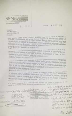 Califican como injusta la situación ya que viola la inamovilidad laboral. Aseveran que sólo se les entregó un documento contentivo con la orden firmado y sellado por José David Cabello, Superintendente Nacional Tributario y hermano del ex presidente de la Asamblea Nacional Diosdado Cabello.